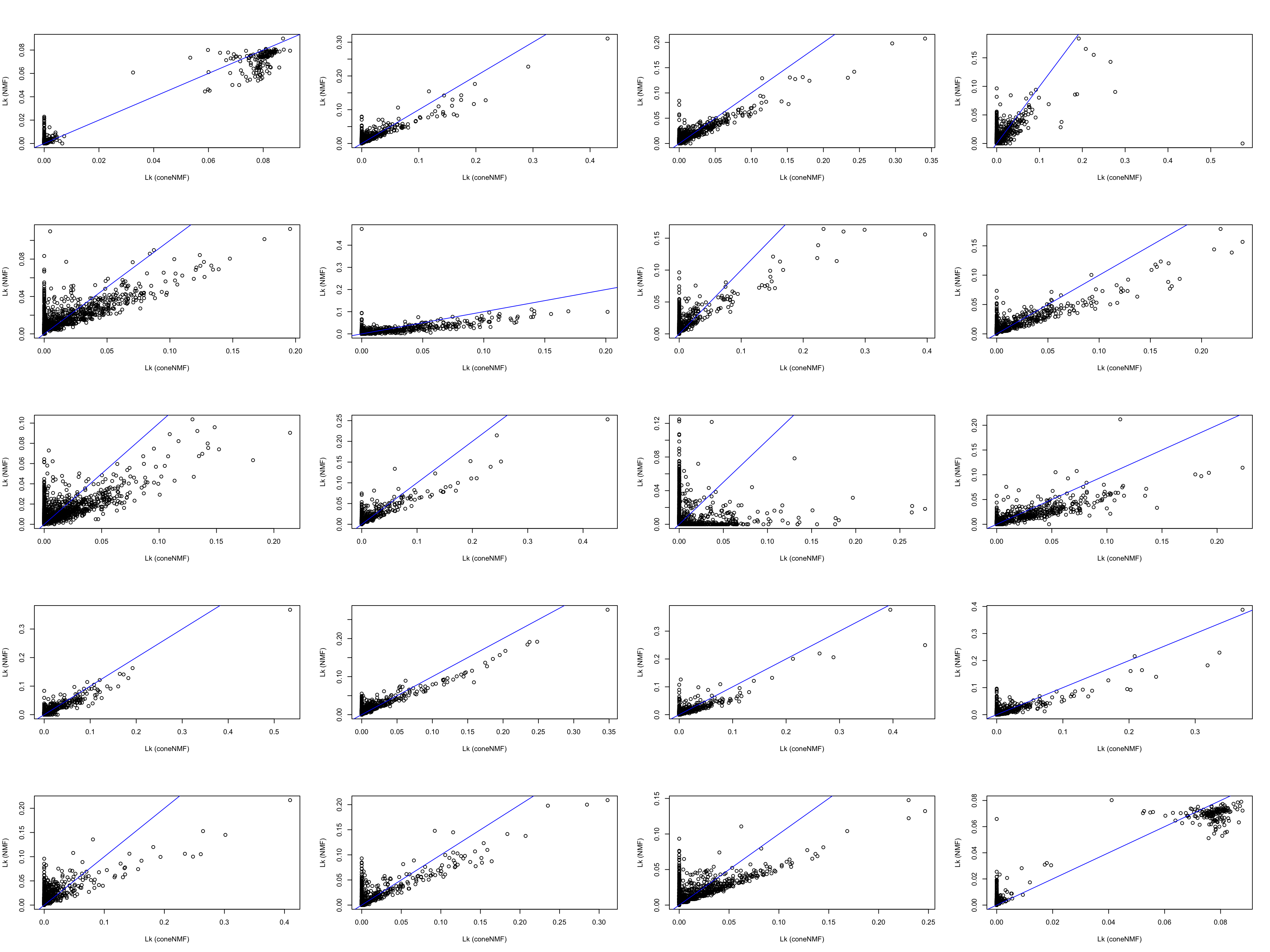 plot(fitted$W[i,], fitted_nmf$H[i,],xlab = "Lk (coneNMF)",ylab = "Lk (NMF)", cex.lab = 1)