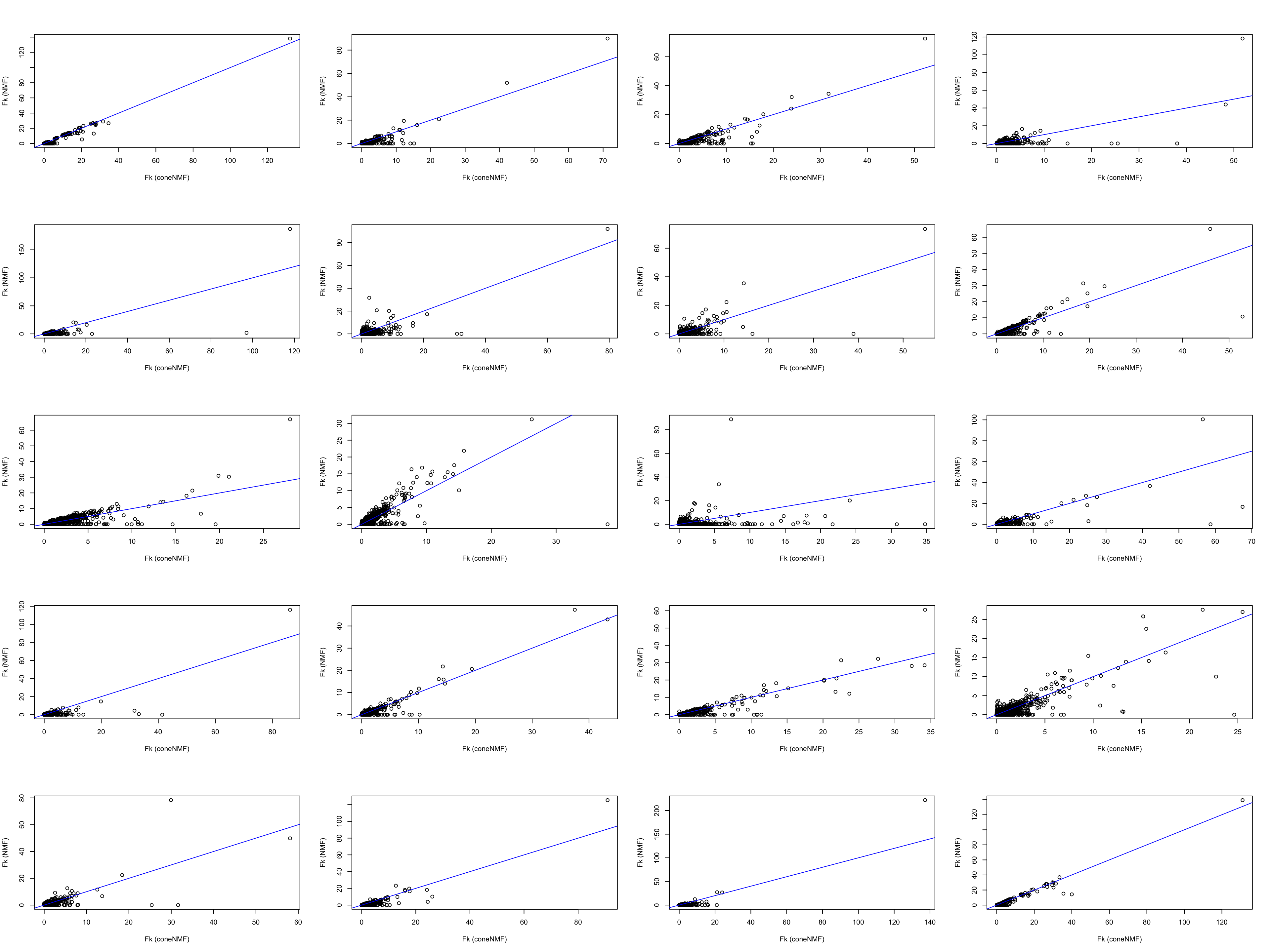 plot(fitted$A[,i], fitted_nmf$W[,i],xlab = "Fk (coneNMF)",ylab = "Fk (NMF)", cex.lab = 1)