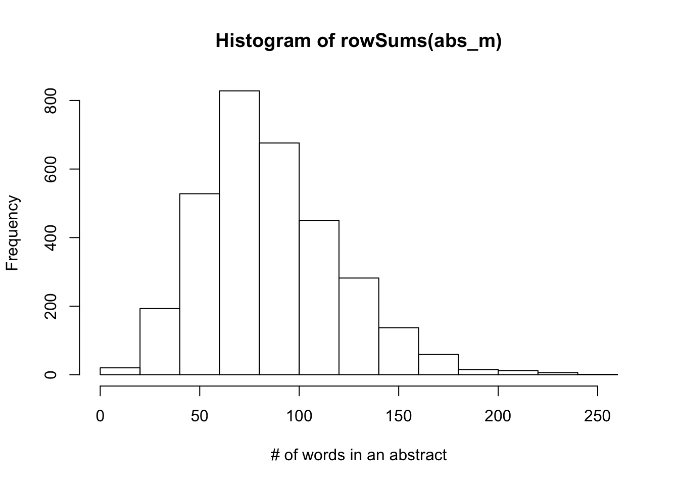 hist(rowSums(abs_m), xlab = "# of words in an abstract")