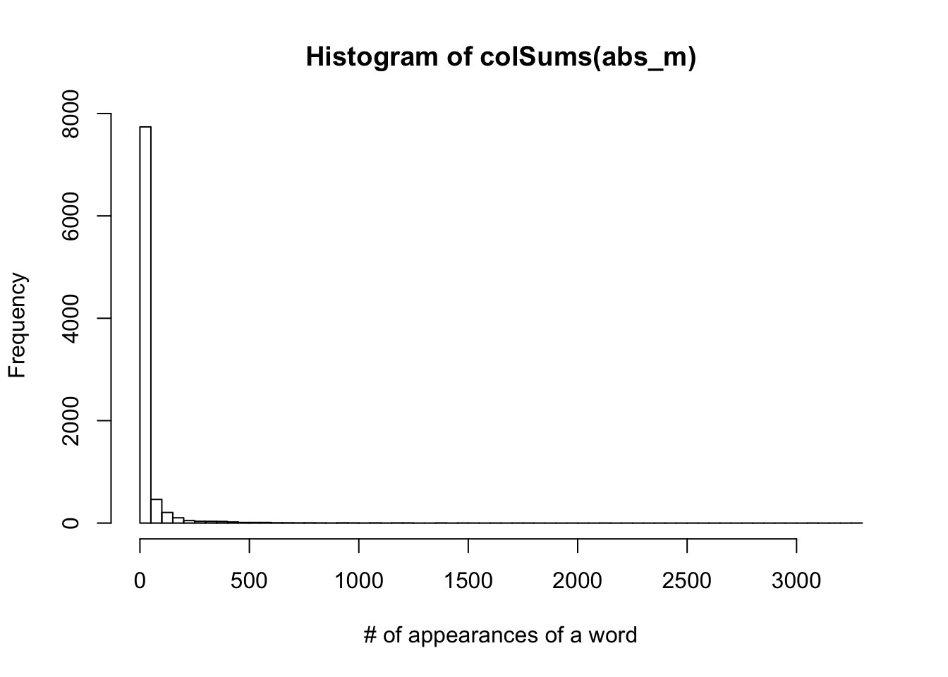 hist(colSums(abs_m), xlab = "# of appearances of a word", breaks = 100)