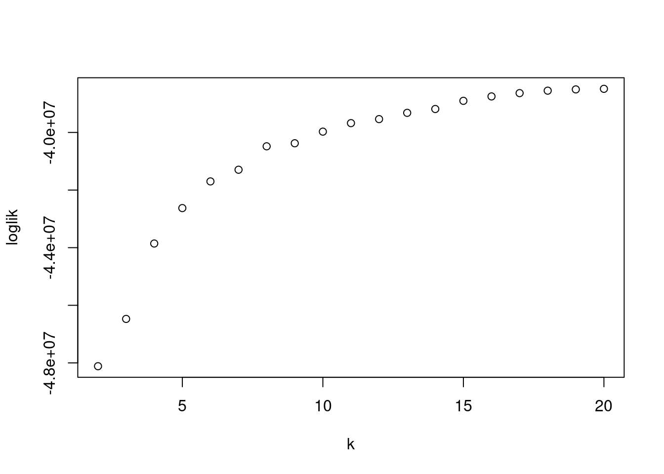 plot(2:20, logliks, xlab = "k", ylab = "loglik")