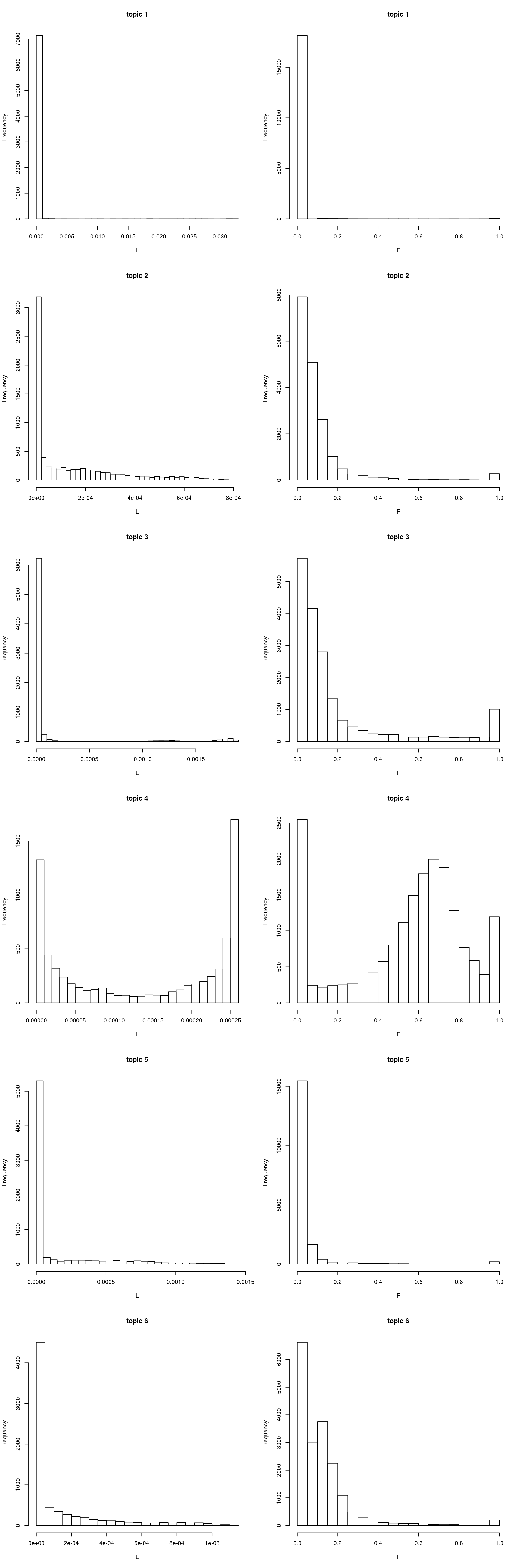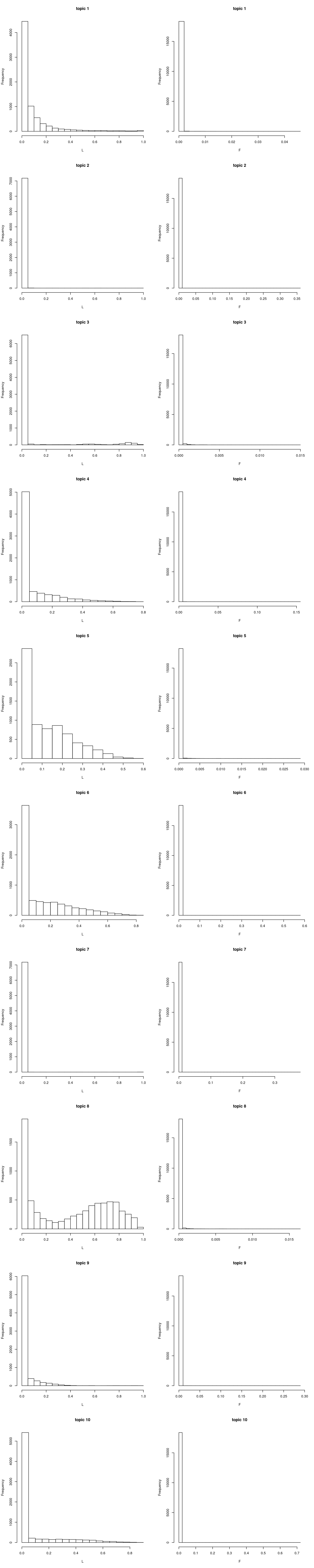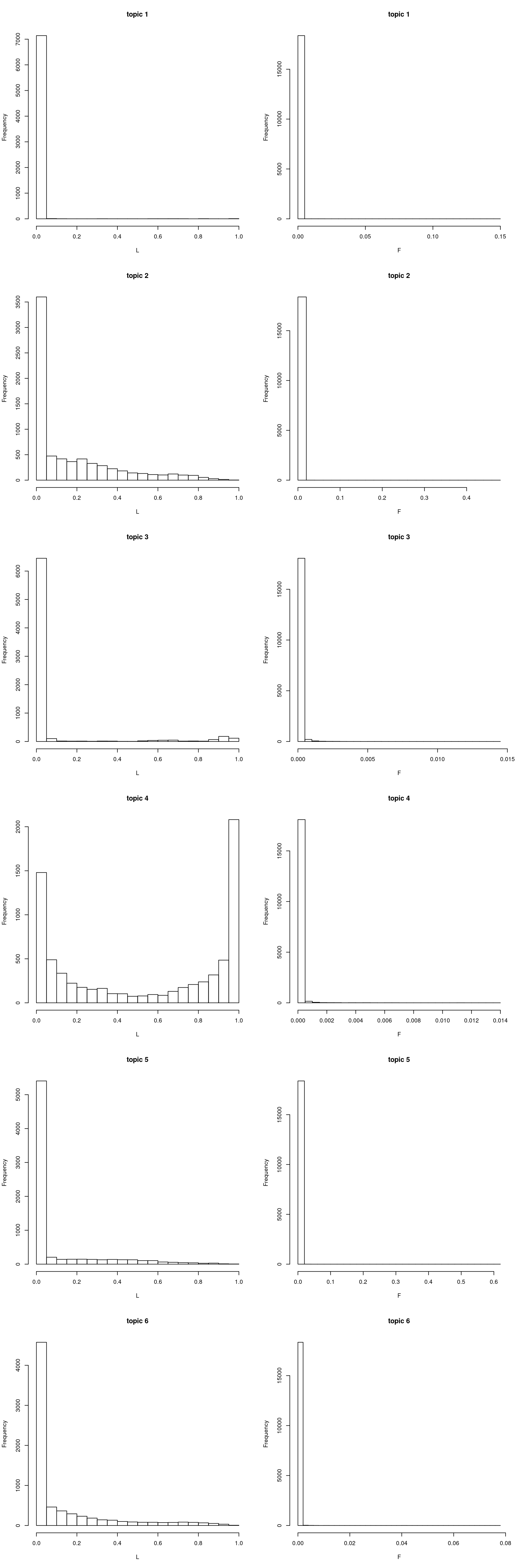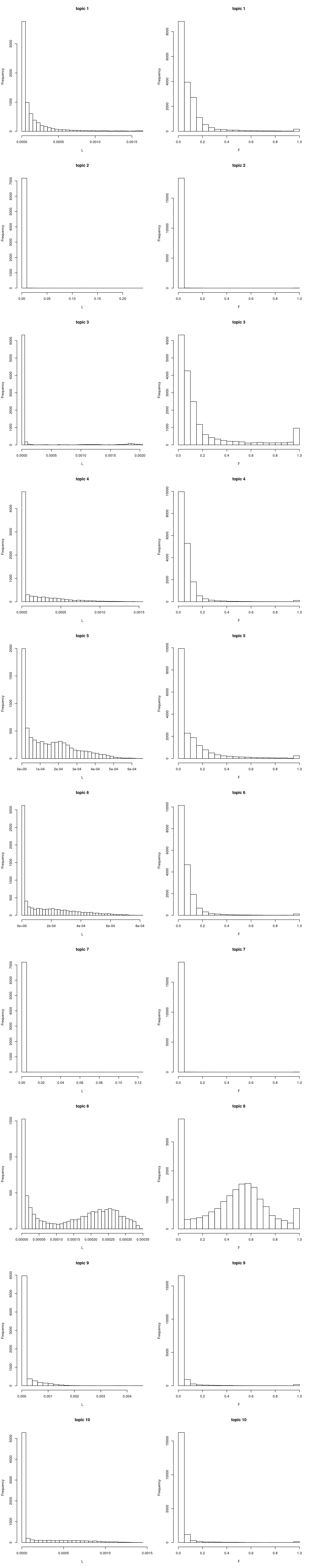 hist(model$F[,i], xlab = "L", main = sprintf("topic %d", i), breaks = 30) ## use the right lab