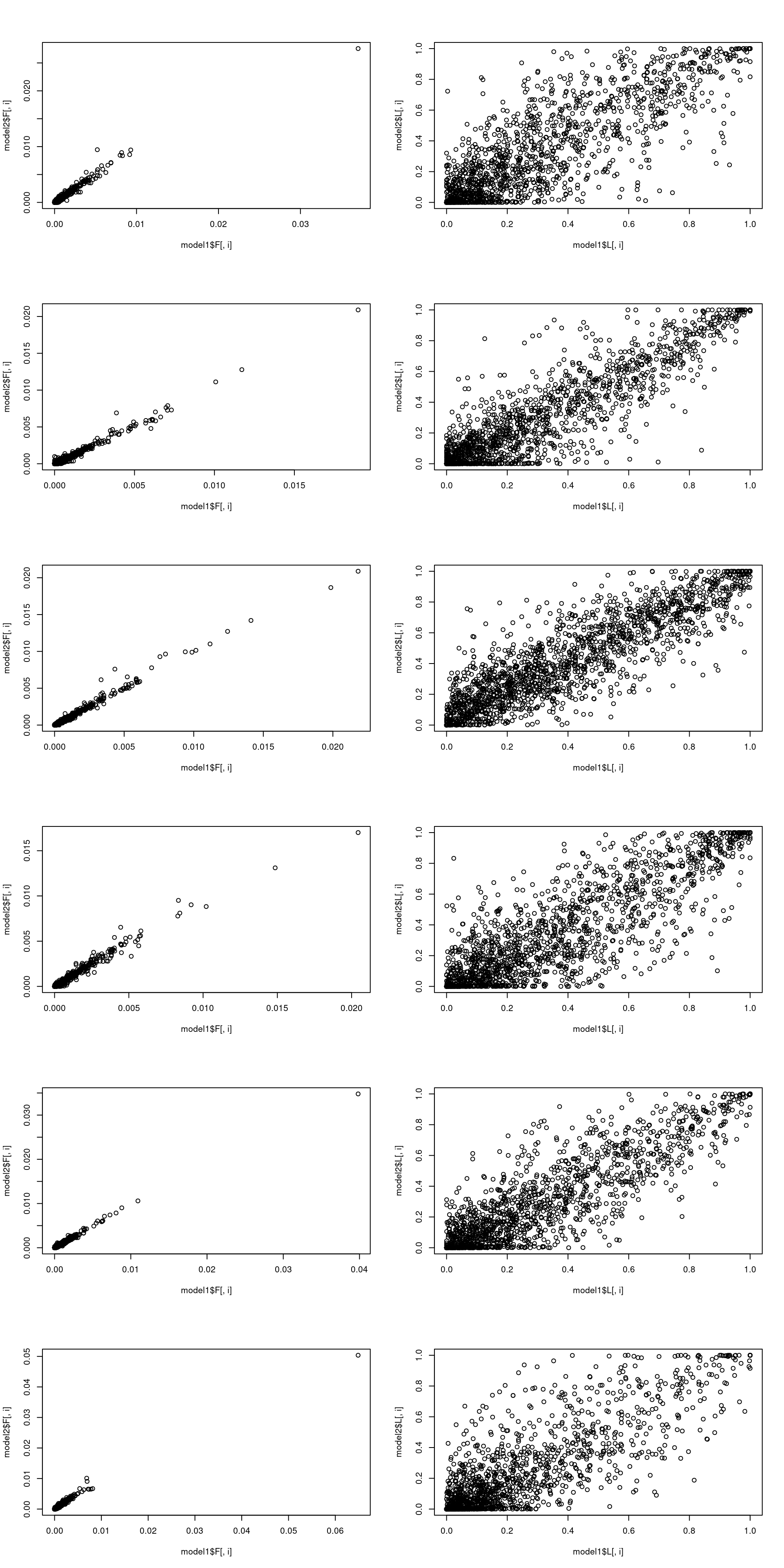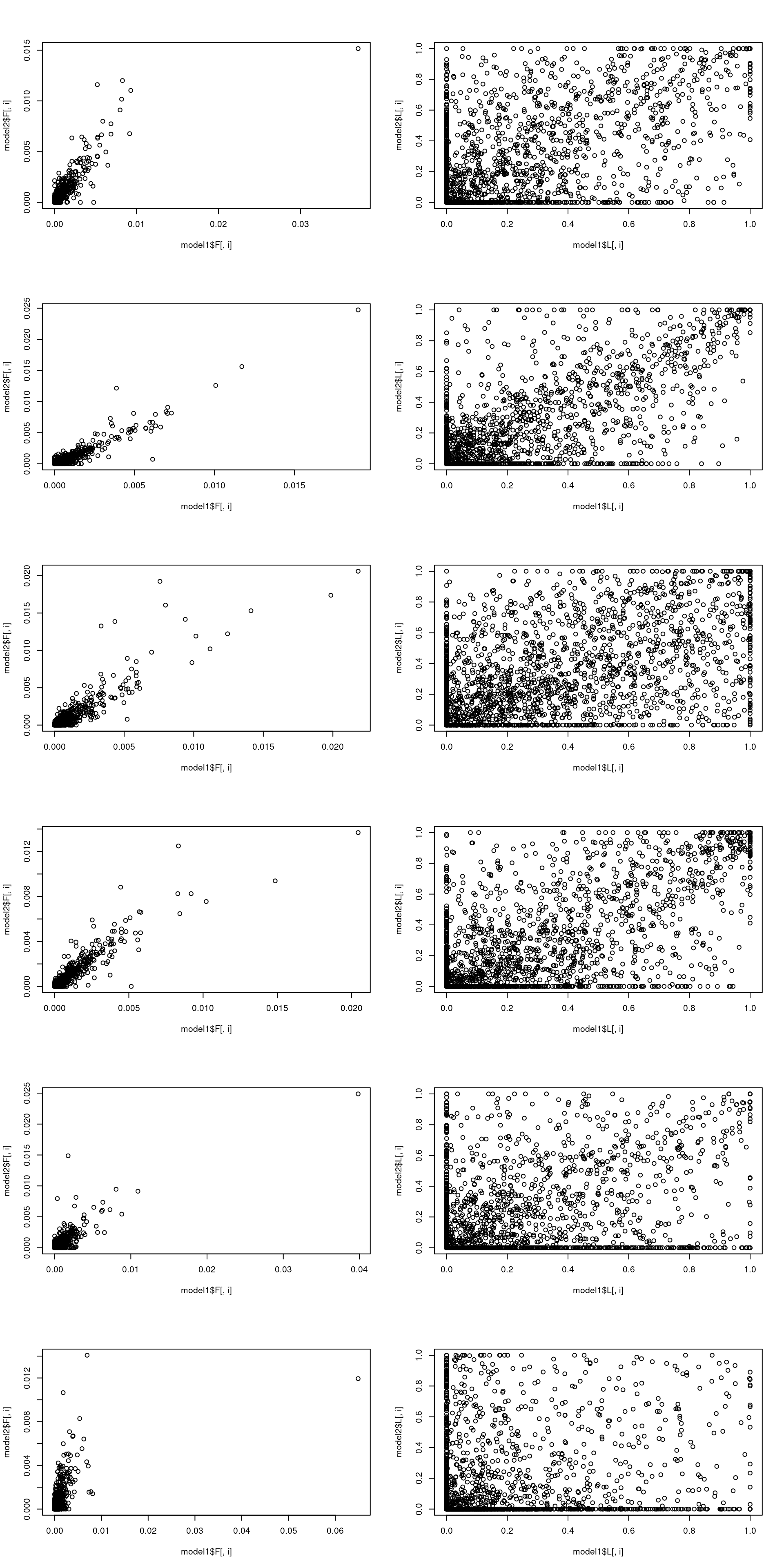 init vs after 10 EM updates\(L\) changes much more than \(F\)