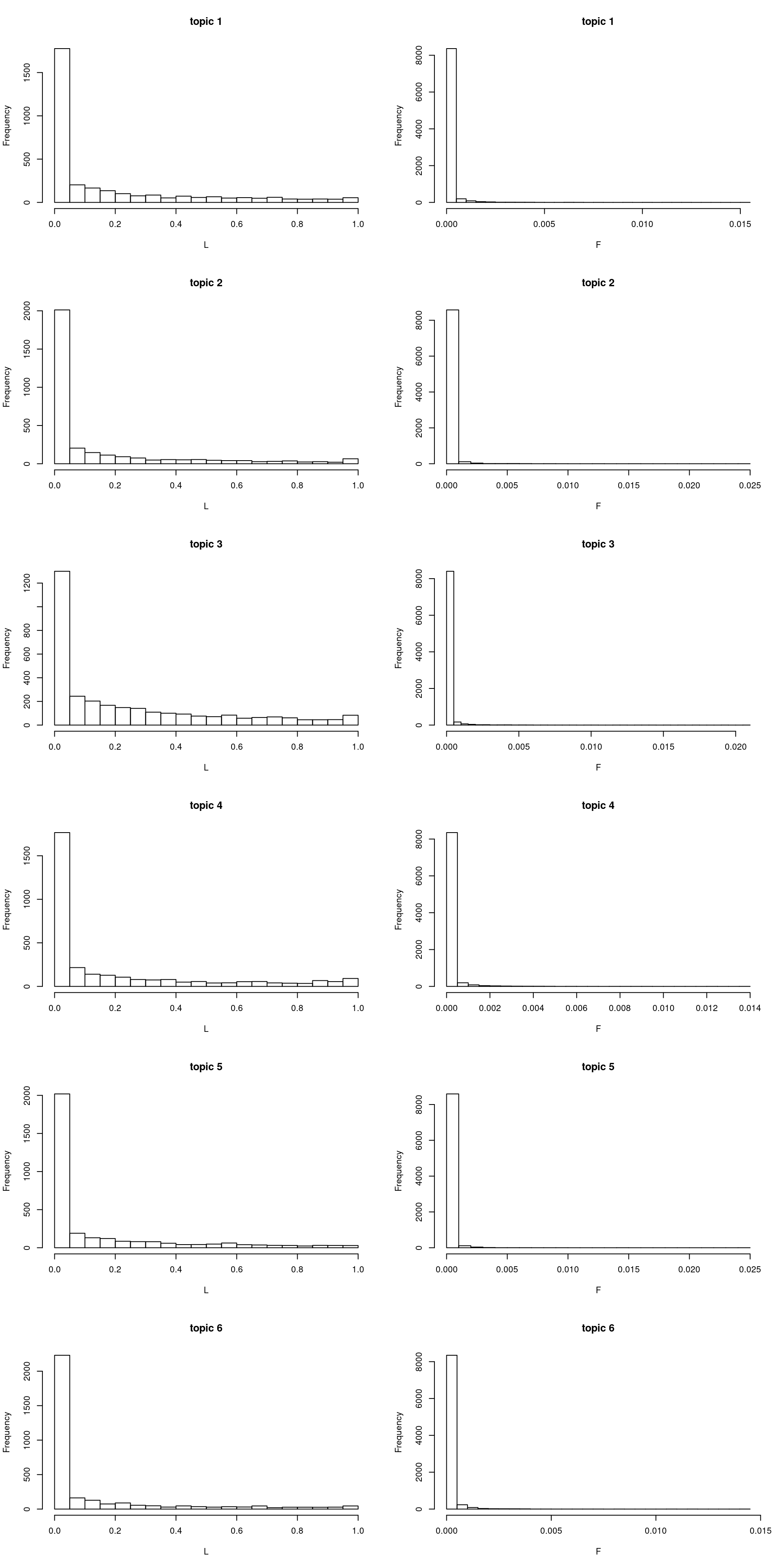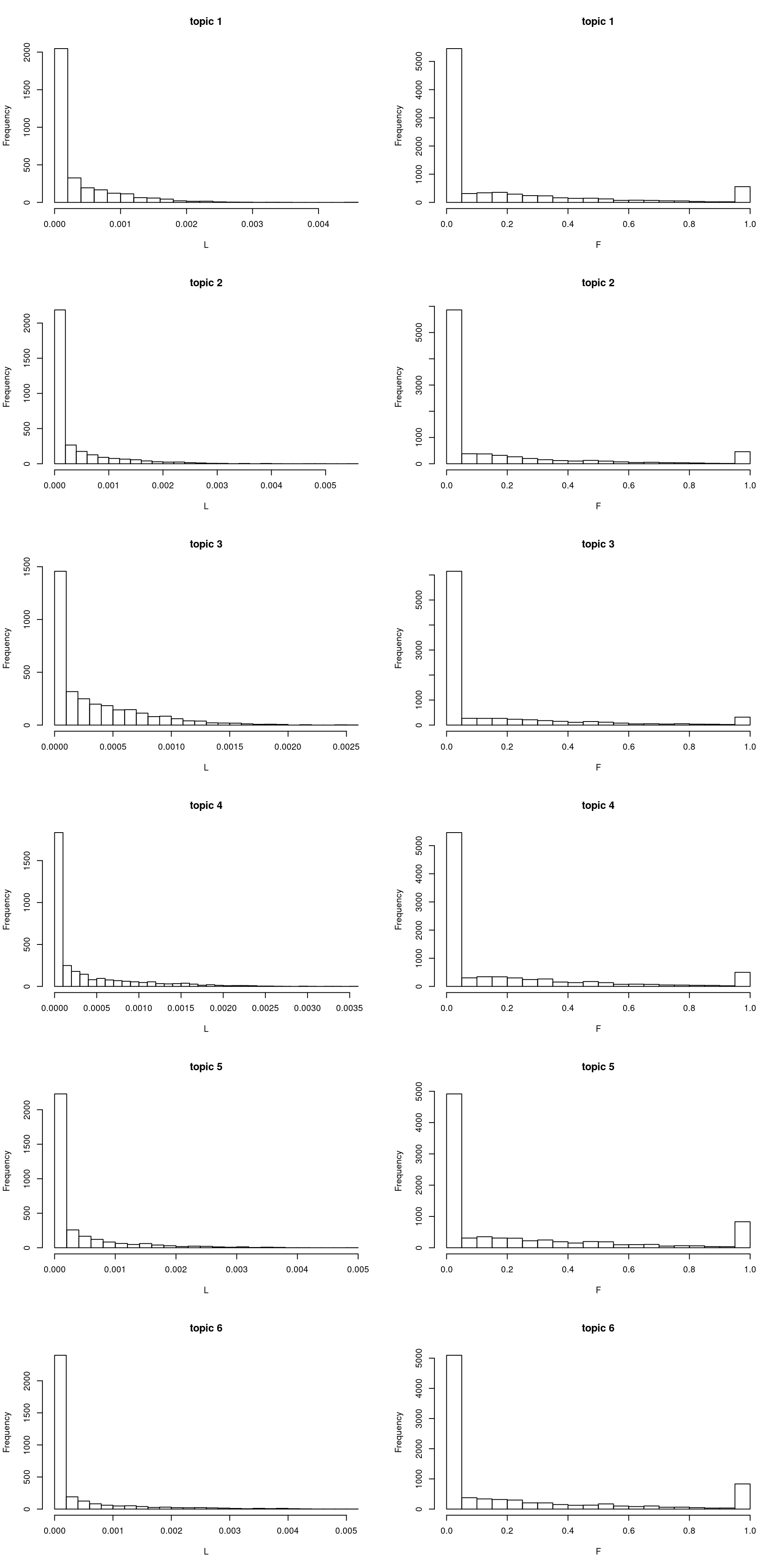 hist(model$F[,i], xlab = "L", main = sprintf("topic %d", i), breaks = 30) ## use the right lab