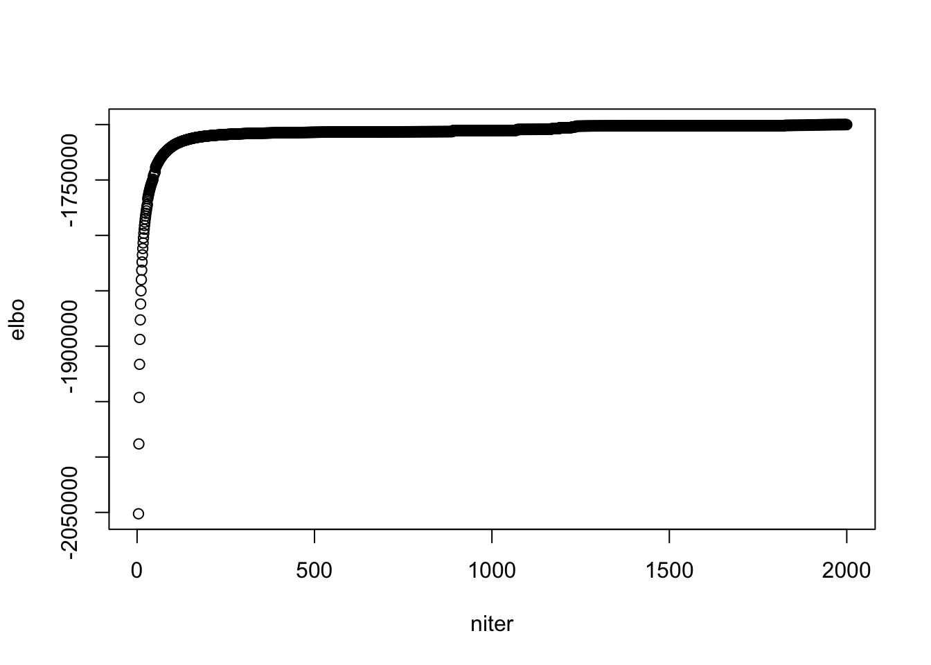 plot(model$ELBO, xlab = "niter", ylab = "elbo")
