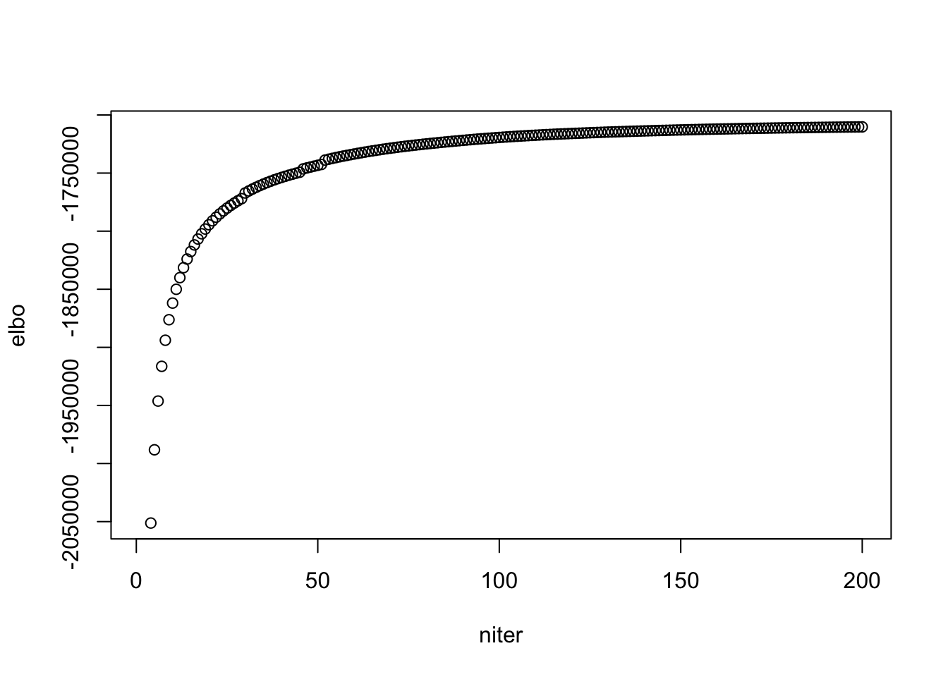 plot(model$ELBO[1:200], xlab = "niter", ylab = "elbo")