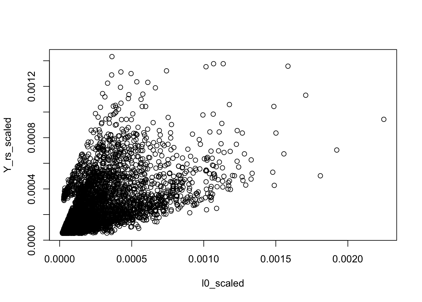 Is the background very different from the rank-1 model? The rank-1 MLE has \(l_{i0} \propto \sum_j X_{ij}\) and \(f_{j0} \propto \sum_i X_{ij}\). Let’s see if the fitted background model is close to it.