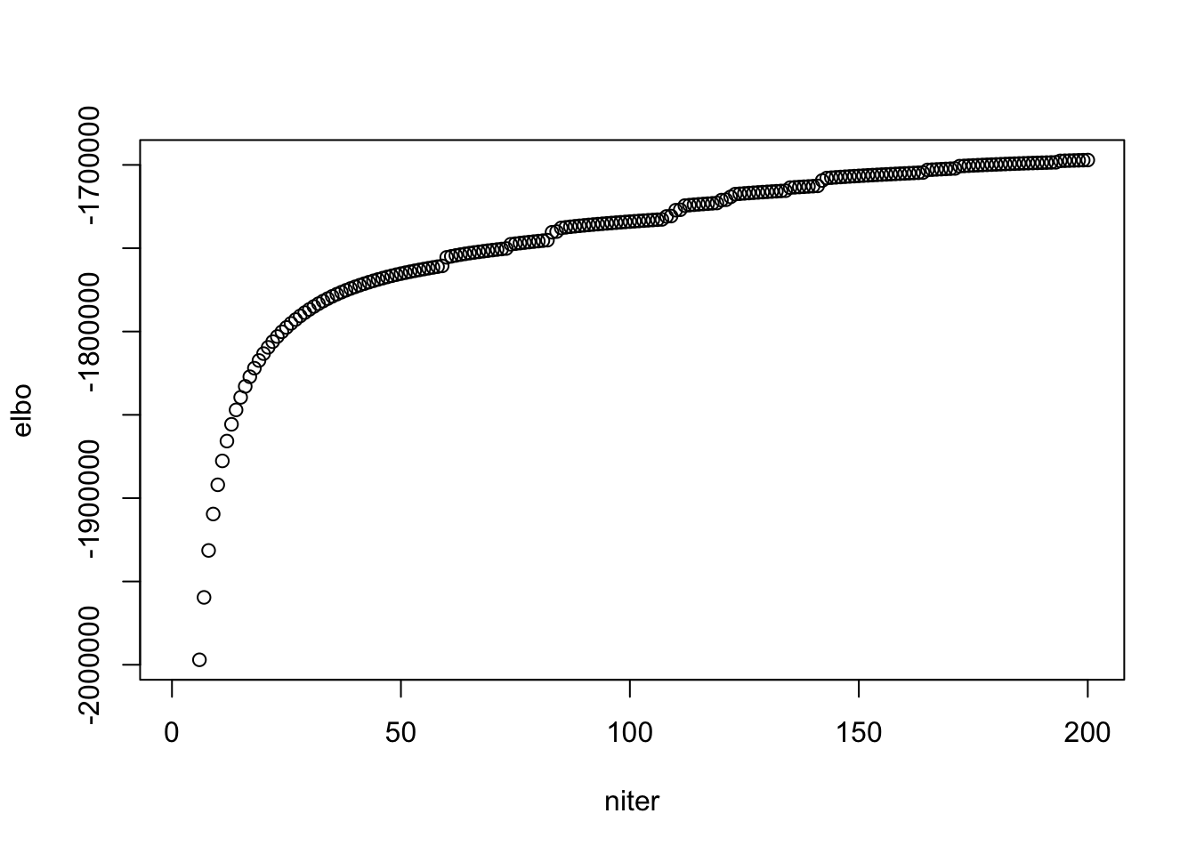 plot(model$ELBO[1:200], xlab = "niter", ylab = "elbo")
