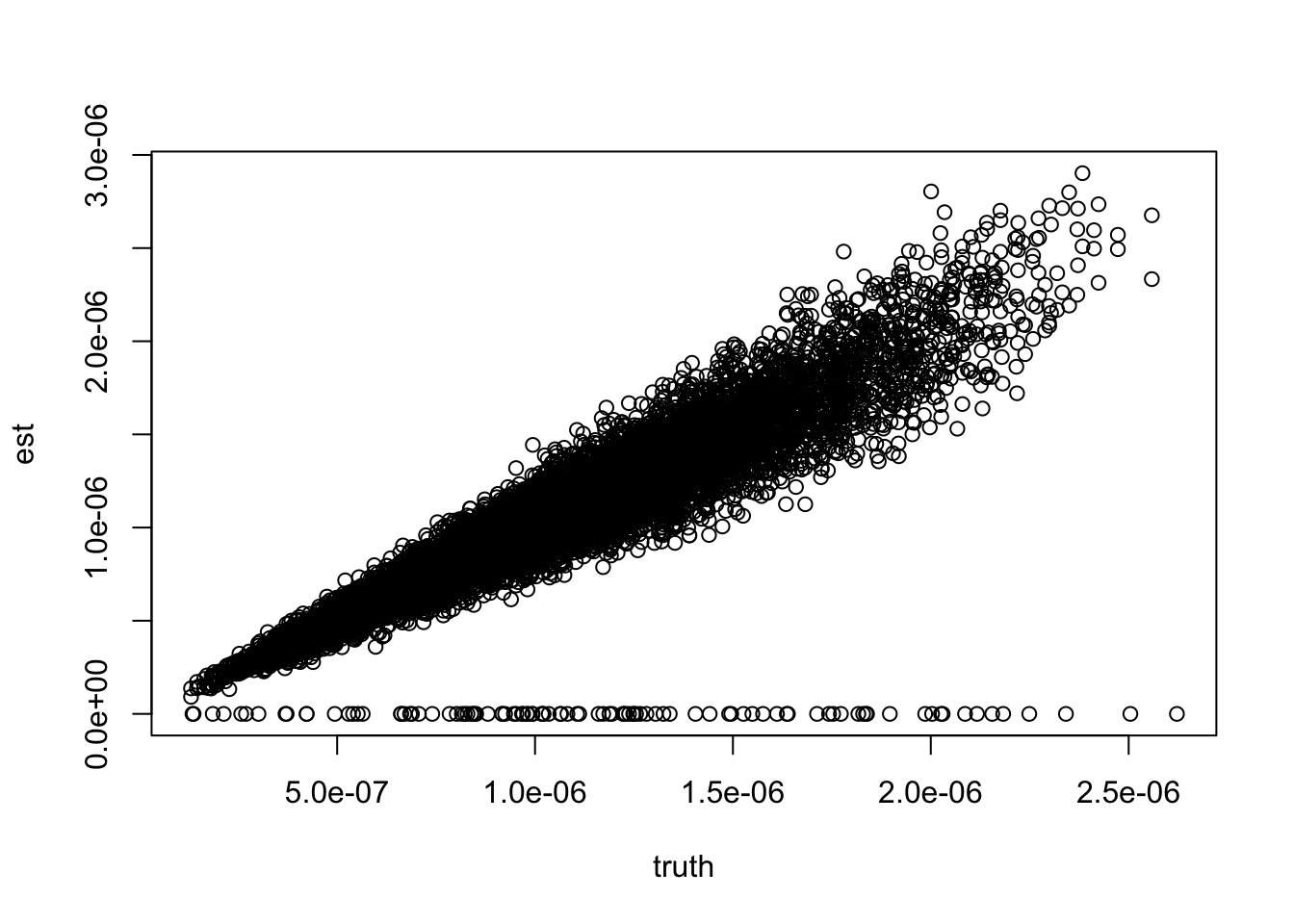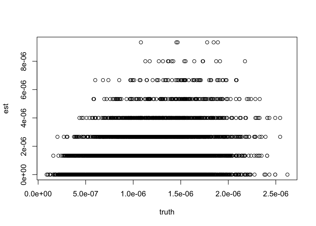plot(sim$cov_word[idx,idx], covhat[idx,idx],xlab ="truth", ylab = "est")