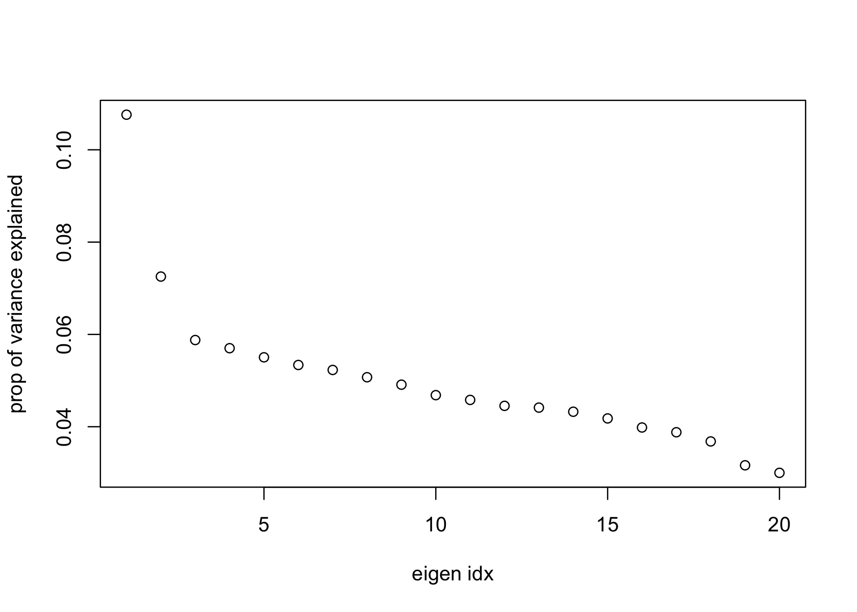 plot(1:length(lams), lams/sum(lams), xlab = "eigen idx", ylab = "prop of variance explained")