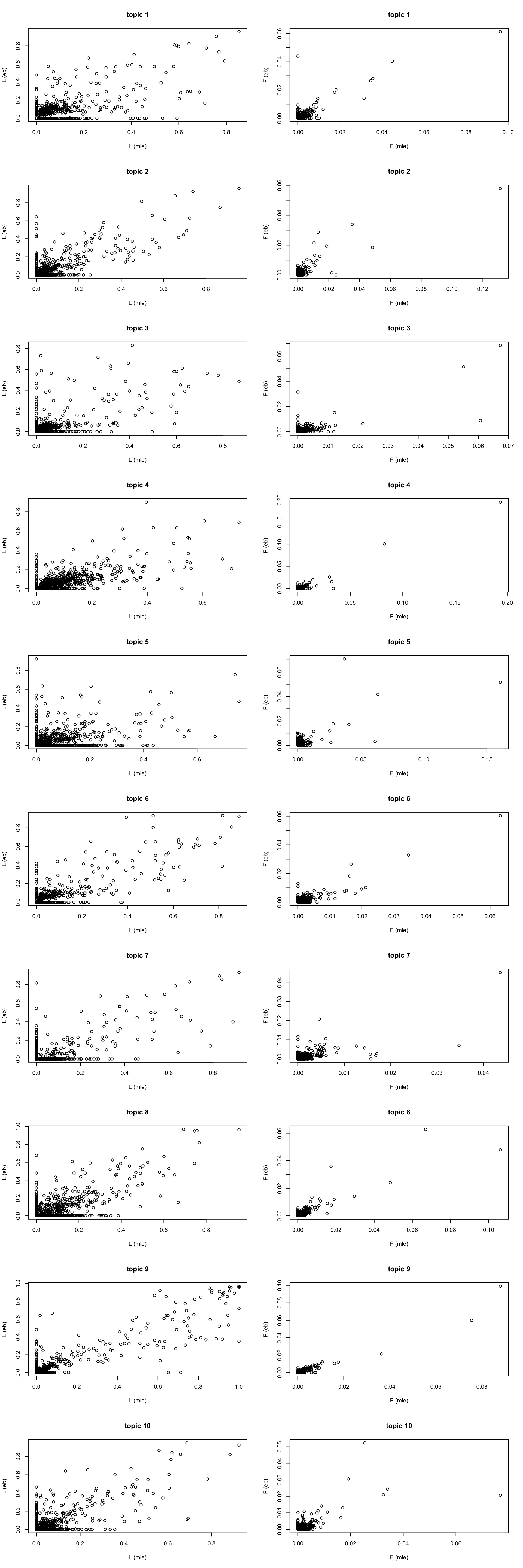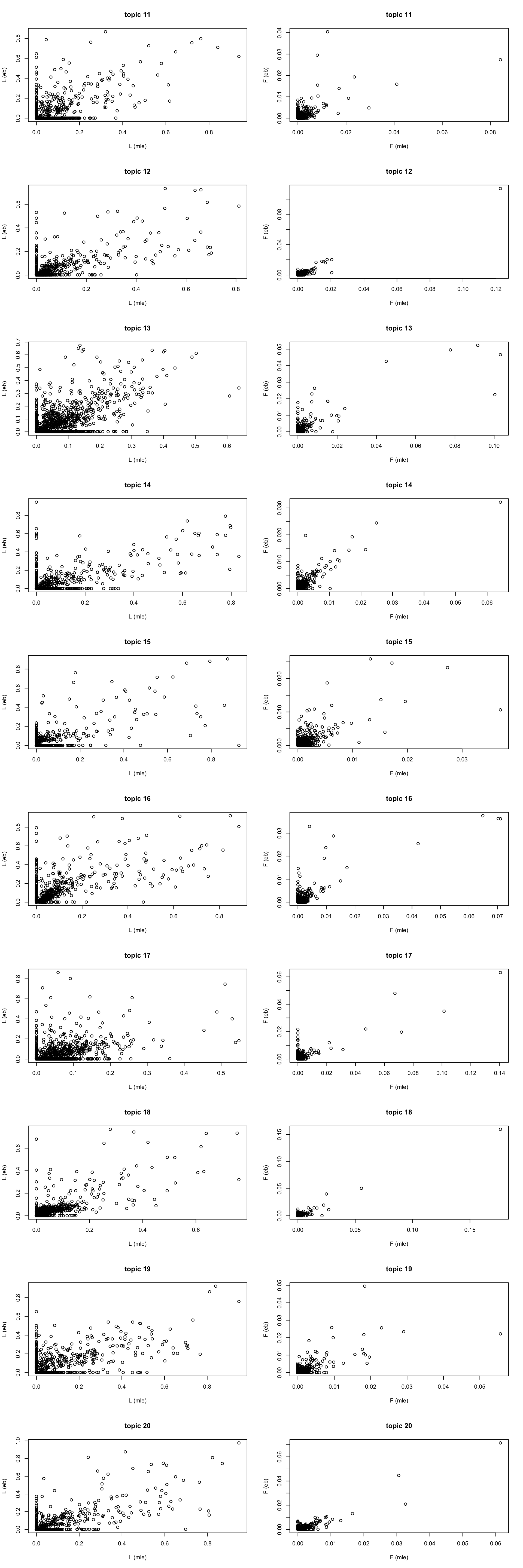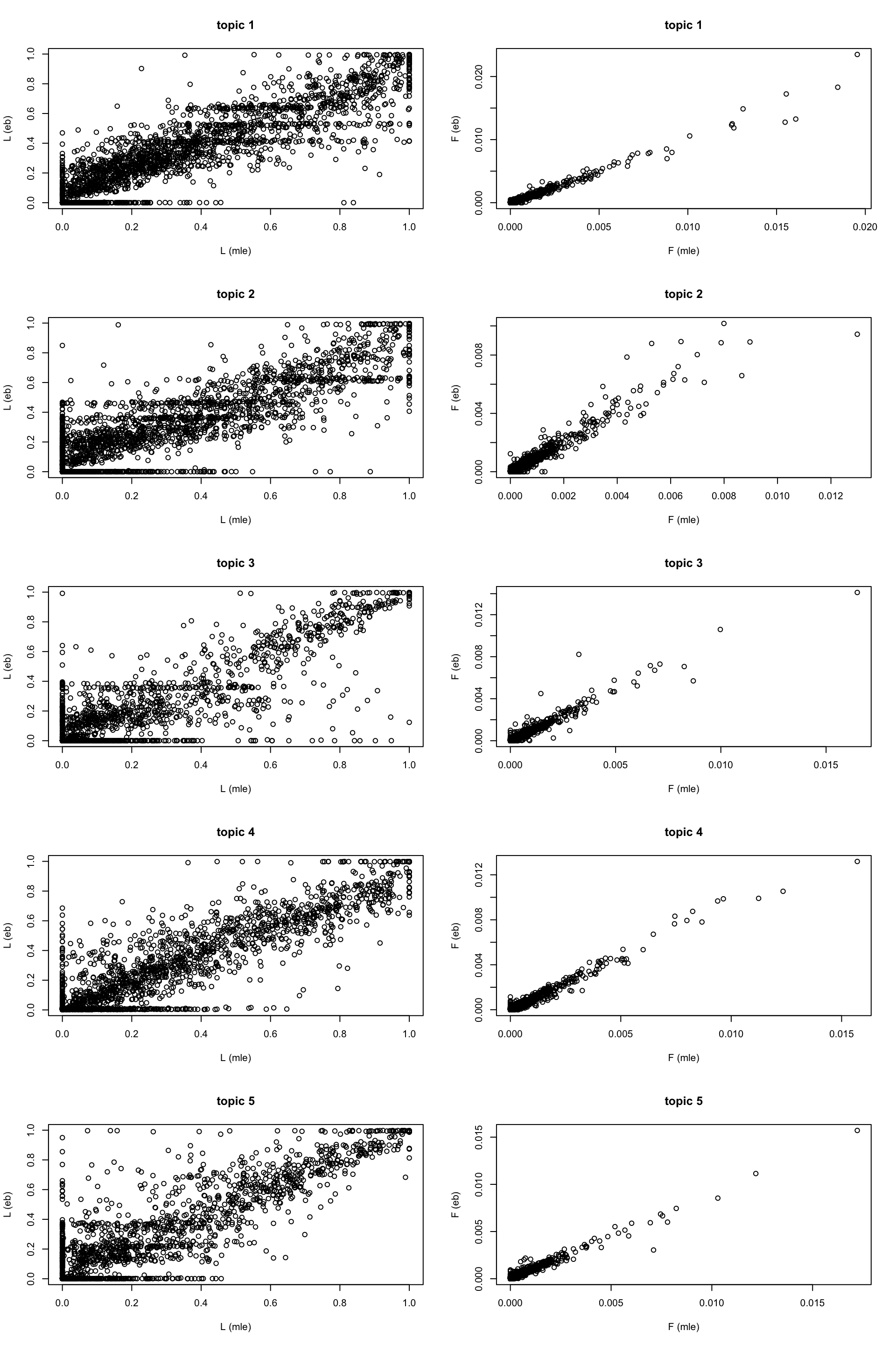 plot(model1$F[,i], model2$F[,i], xlab = "F (mle)", ylab = "F (eb)", main = sprintf("topic %d", i))