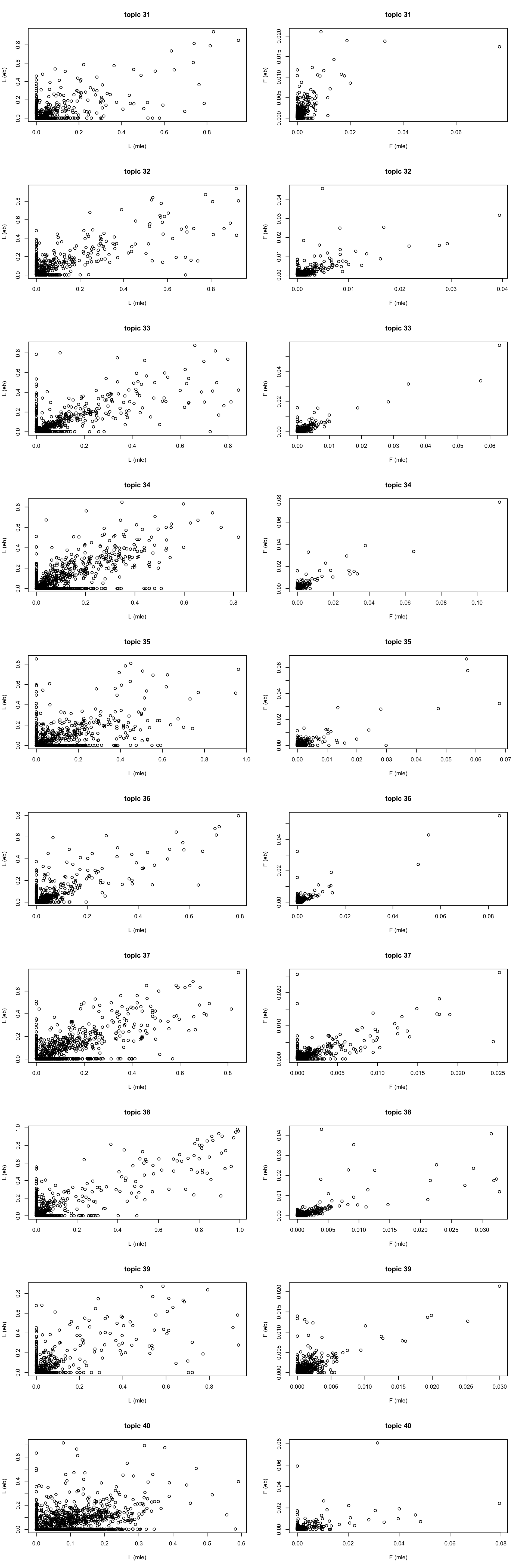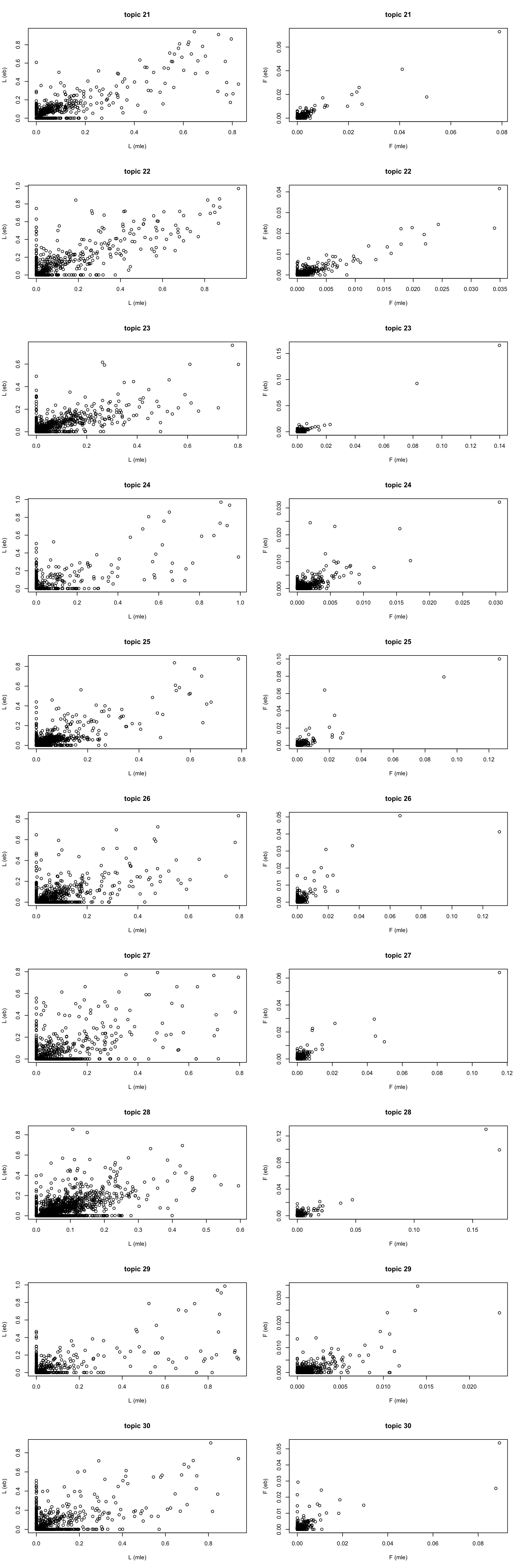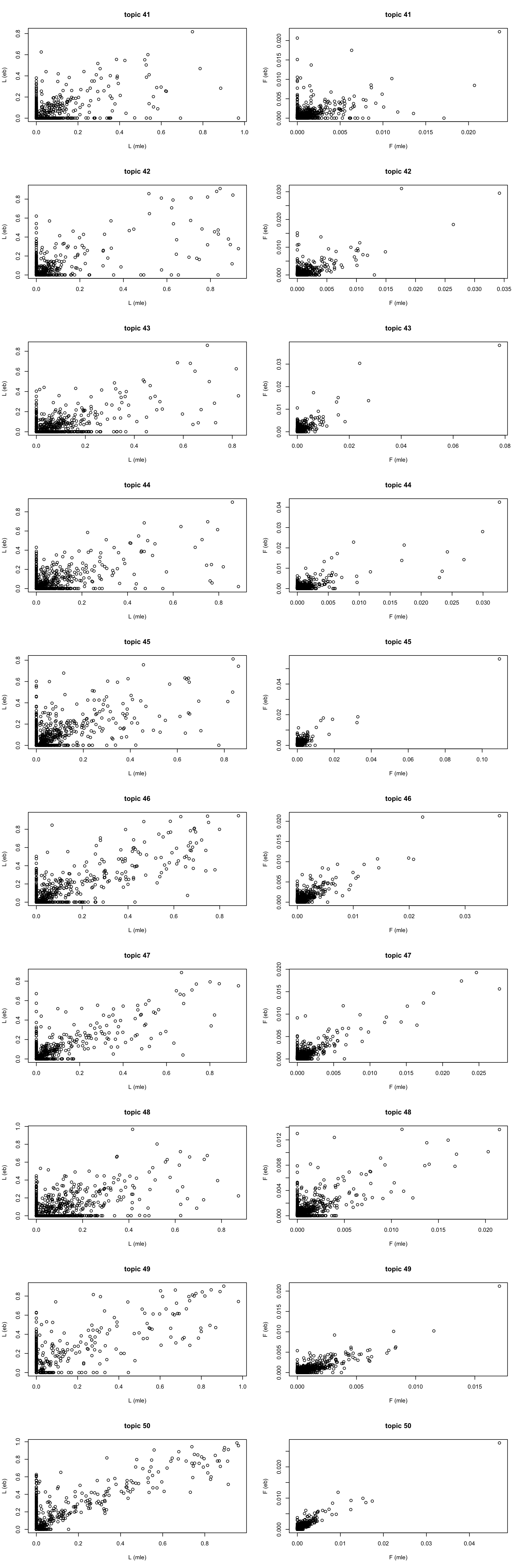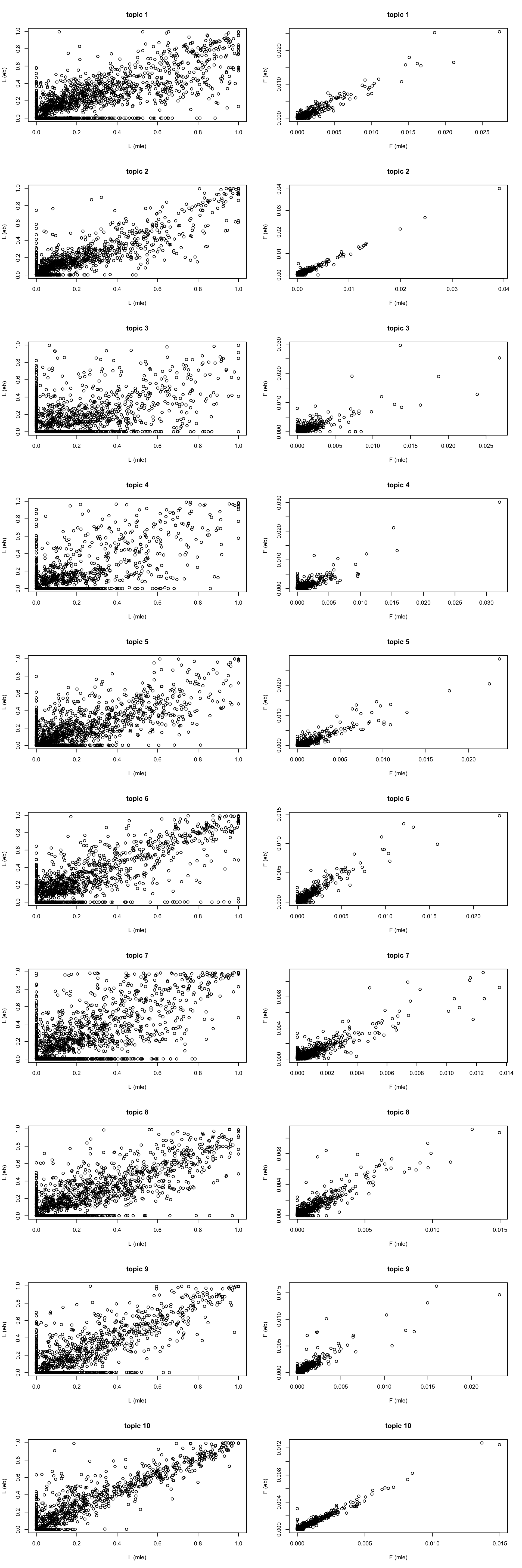 plot(model1$F[,i], model2$F[,i], xlab = "F (mle)", ylab = "F (eb)", main = sprintf("topic %d", i))