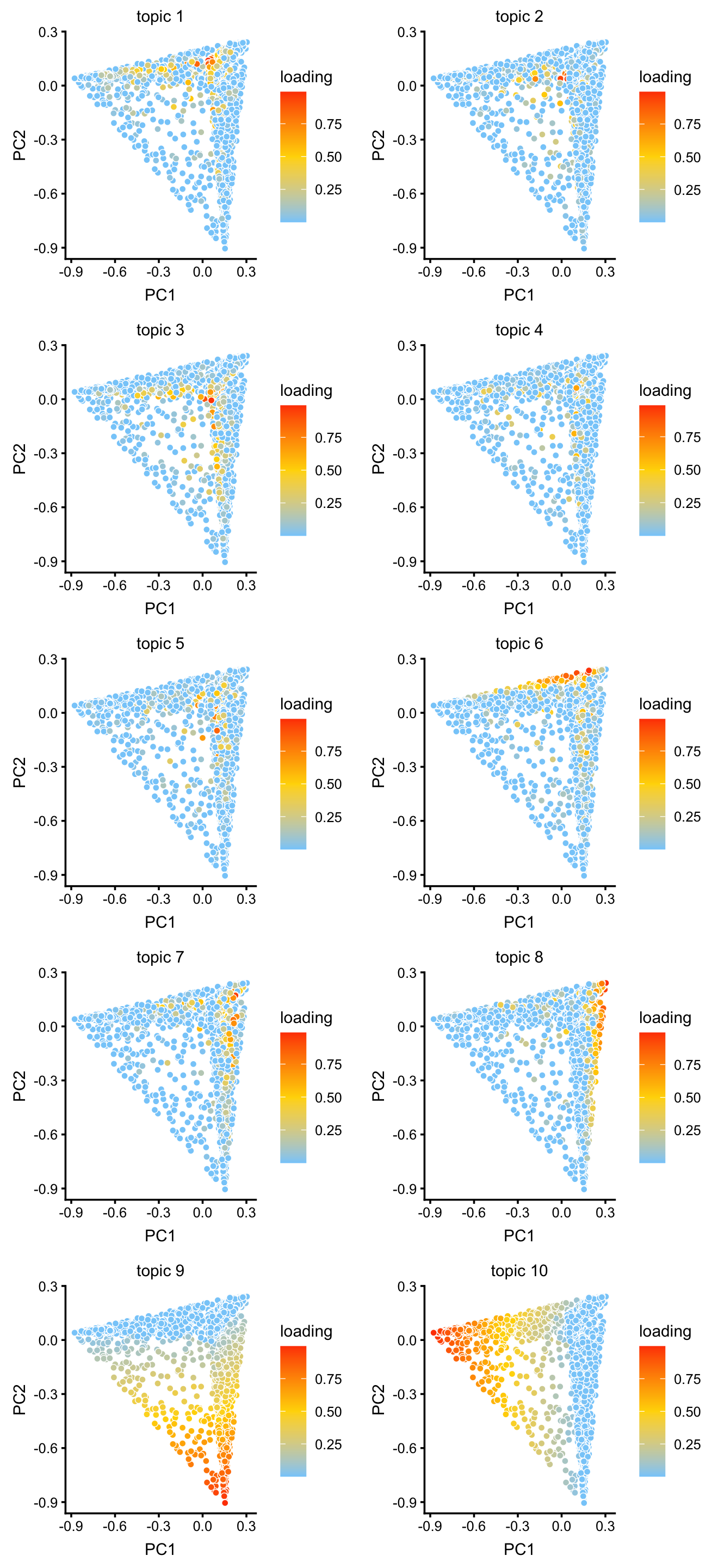 Note that: \(X_{ij} \sim Pois(\sum_k w_k l_{i0} l_{ik} f_{j0} f_{jk})\). I use \(\text{loading}_{ik} = w_k l_{ik}\) then scale it so that each row sums to 1. There are other ways to get a meaningful loading…