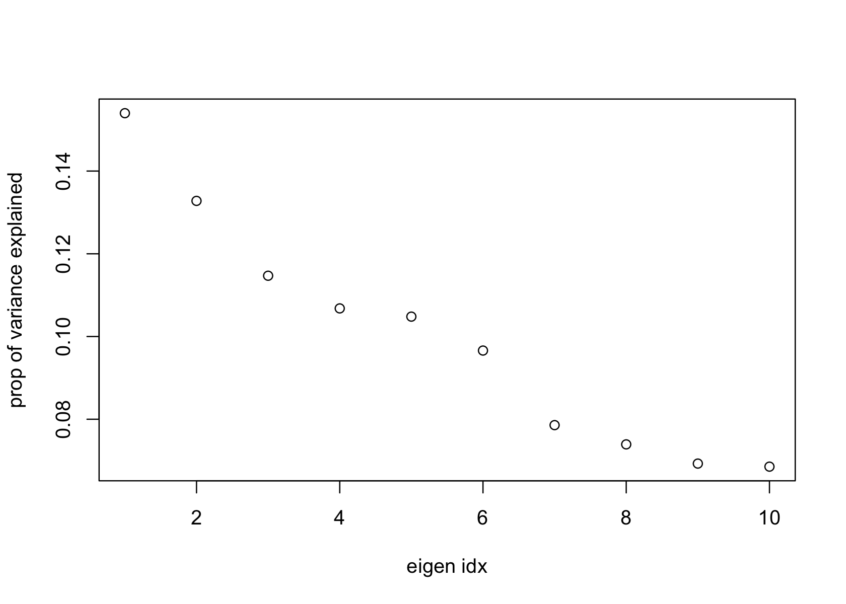 plot(1:length(lams), lams/sum(lams), xlab = "eigen idx", ylab = "prop of variance explained")