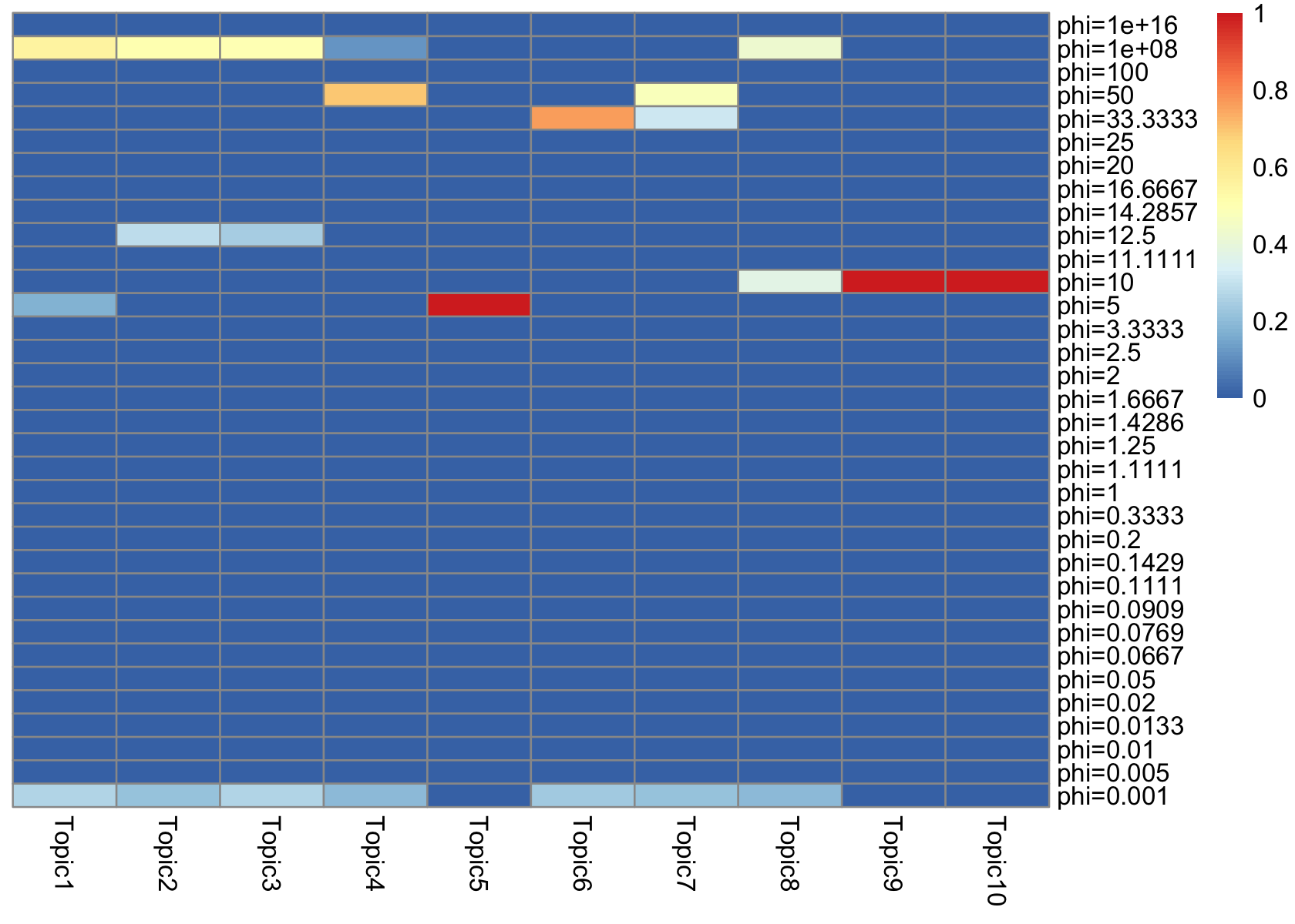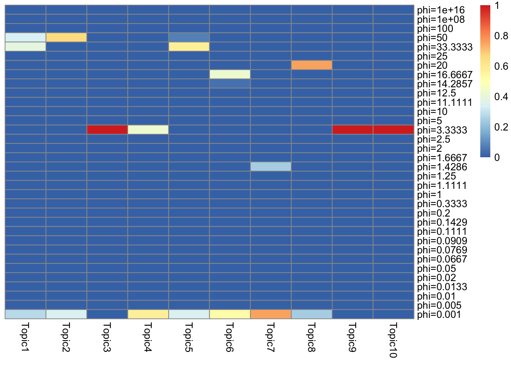 \(l_{ik} \sim \pi_{kl} Ga(1/\phi_{kl}, 1/\phi_{kl})\). Note \(Var(X) = \phi, X \sim Ga(1/\phi, 1/\phi)\), and for very big \(\phi\), the mass is almost all on 0.