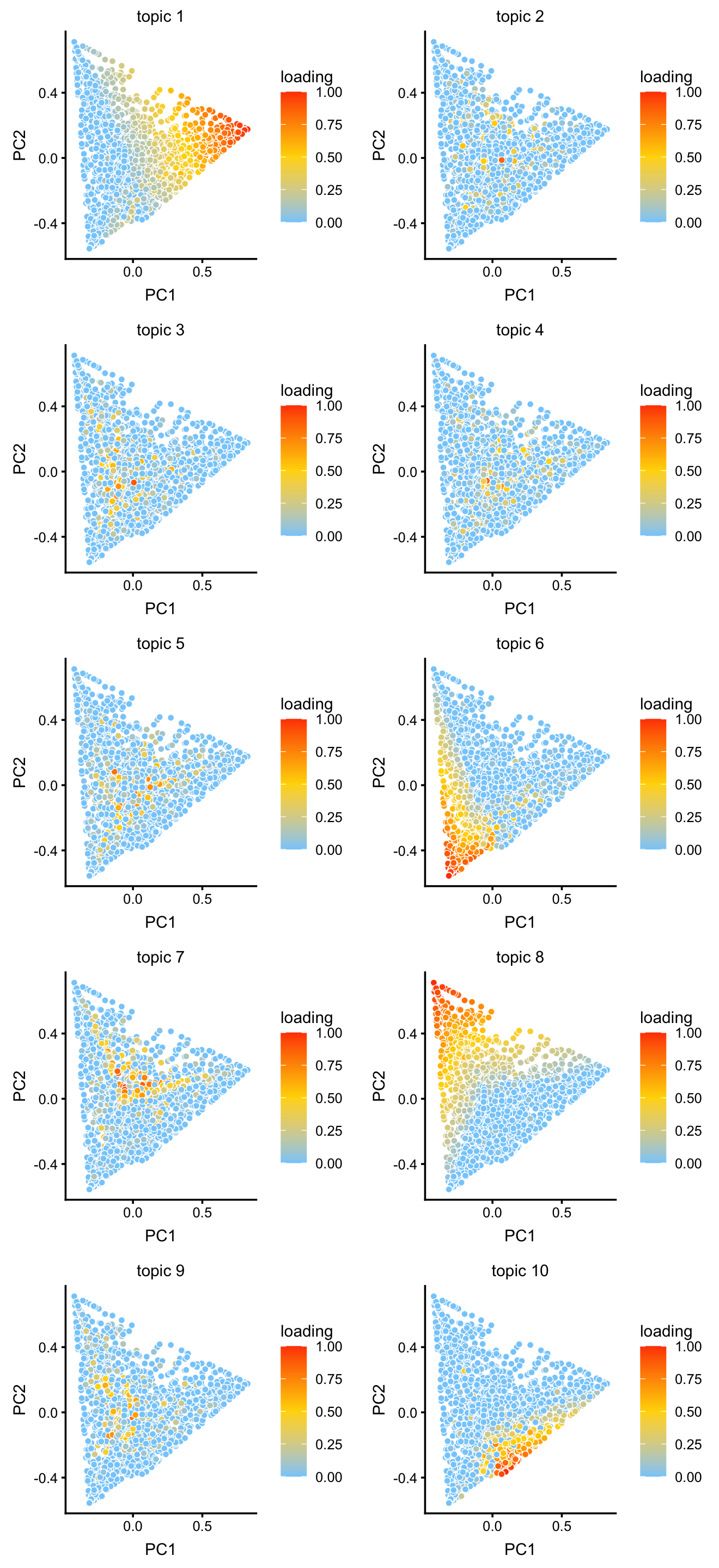 Note that: \(X_{ij} \sim Pois(\sum_k w_k l_{i0} l_{ik} f_{j0} f_{jk})\). I use \(\text{loading}_{ik} = w_k l_{ik}\) then scale it so that each row sums to 1. There are other ways to get a meaningful loading…