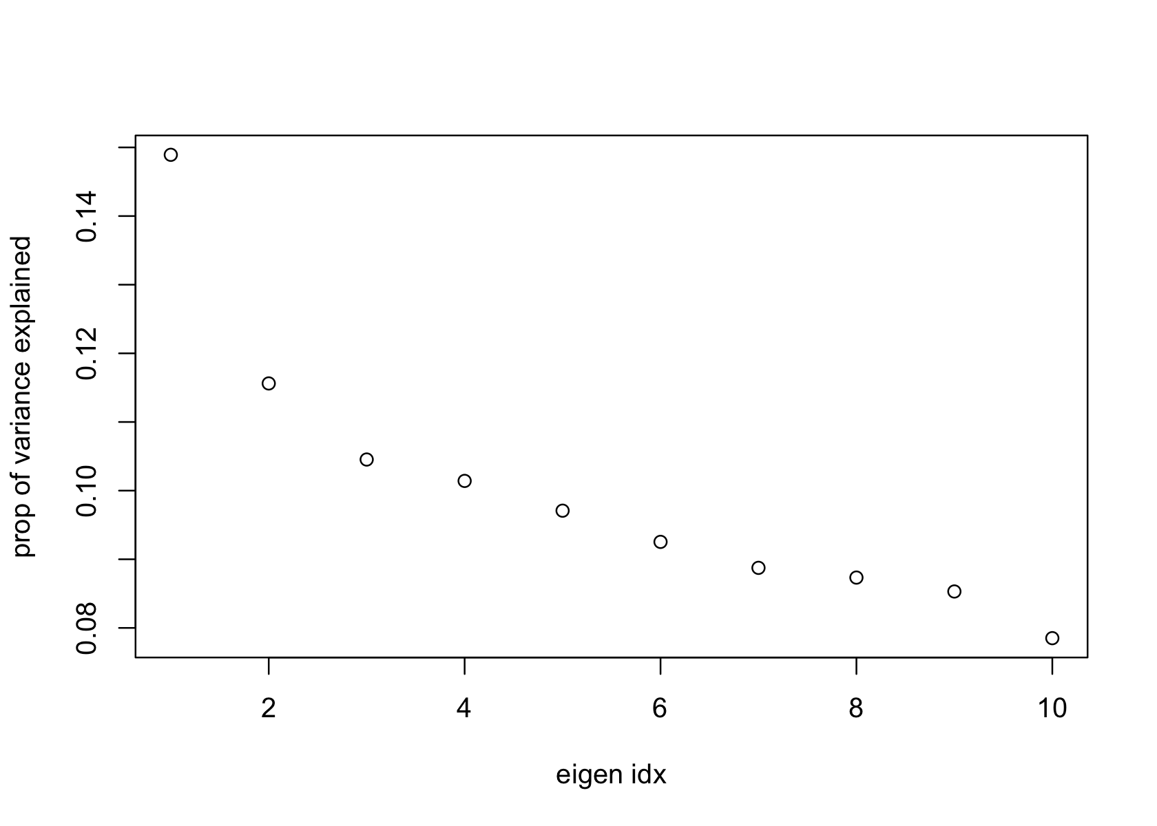 plot(1:length(lams), lams/sum(lams), xlab = "eigen idx", ylab = "prop of variance explained")