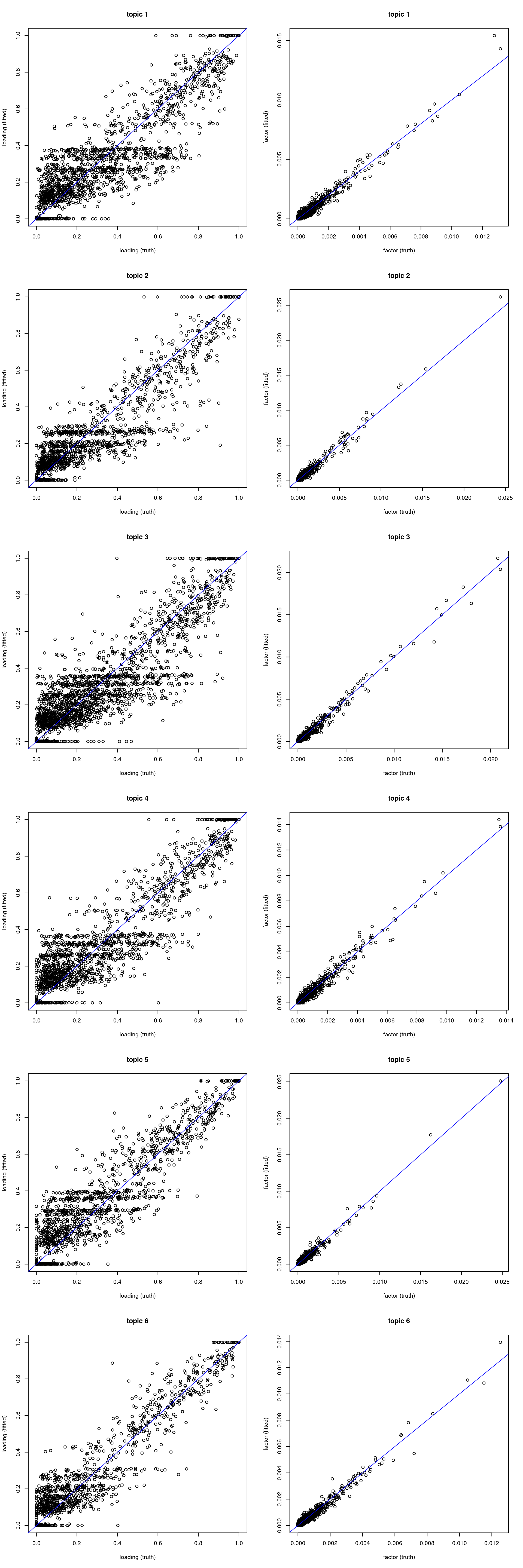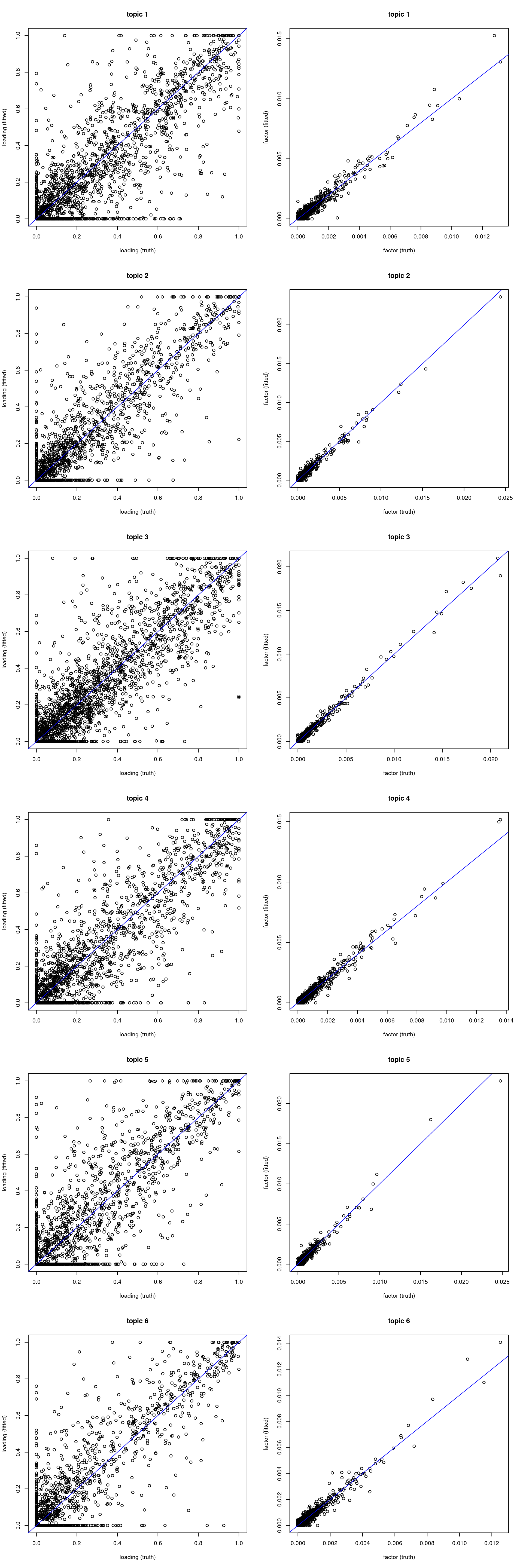 plot(truth$L[,i], model$L[,j], xlab = "loading (truth)", ylab = "loading (fitted)", main = sprintf("topic %d", i))