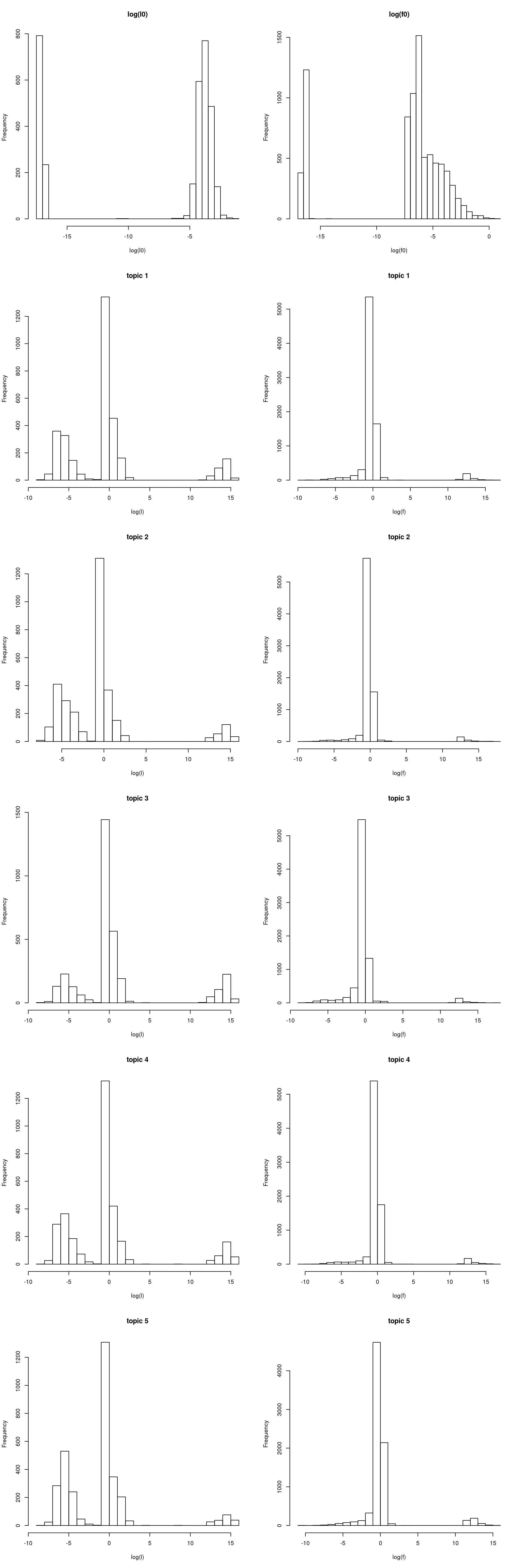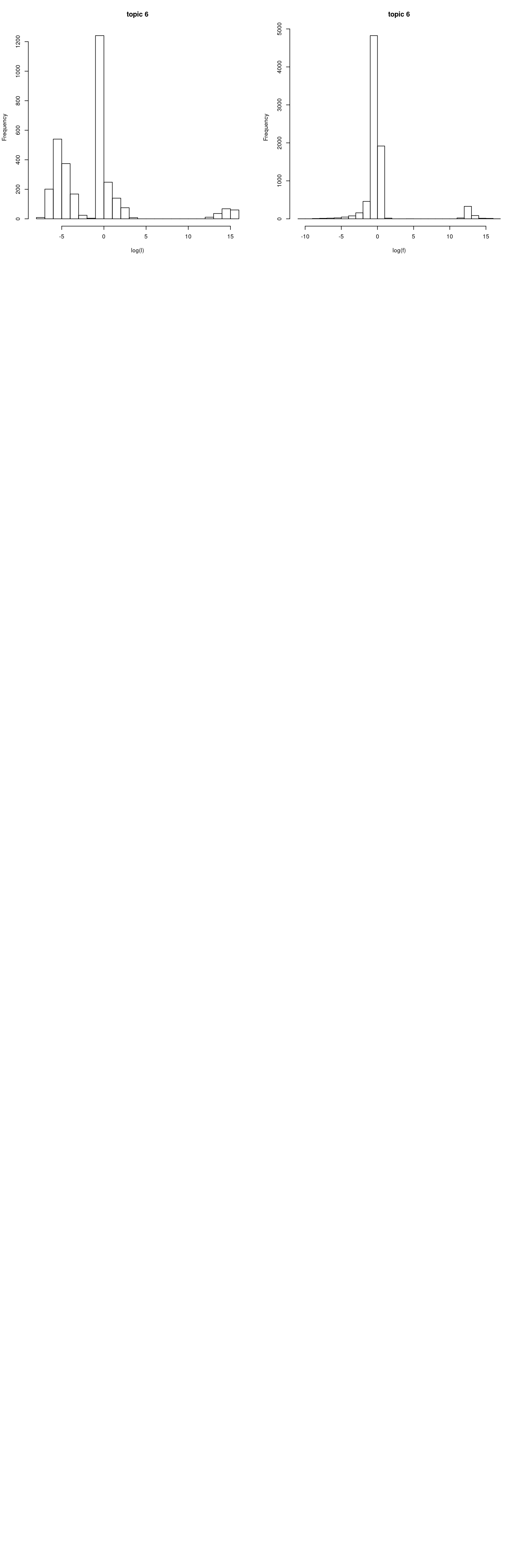 hist(log(fitted.eb$qg$qfs_mean[,i]), breaks = 30, xlab = "log(f)", main = sprintf("topic %d", i))